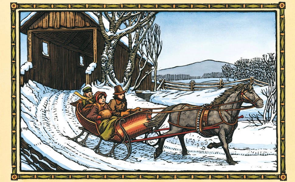 There were few cars on the road as we made our way even further north through small towns, farms, stands of trees, and by an icy lake. The snow, heavy and wet, covered everything — spacious commons, memorials to Union soldiers, clapboard houses, and old churches. The world was downy and white, quiet in monochrome austerity. It was if we had driven back into a woodcut of “over the river and through the woods.”
