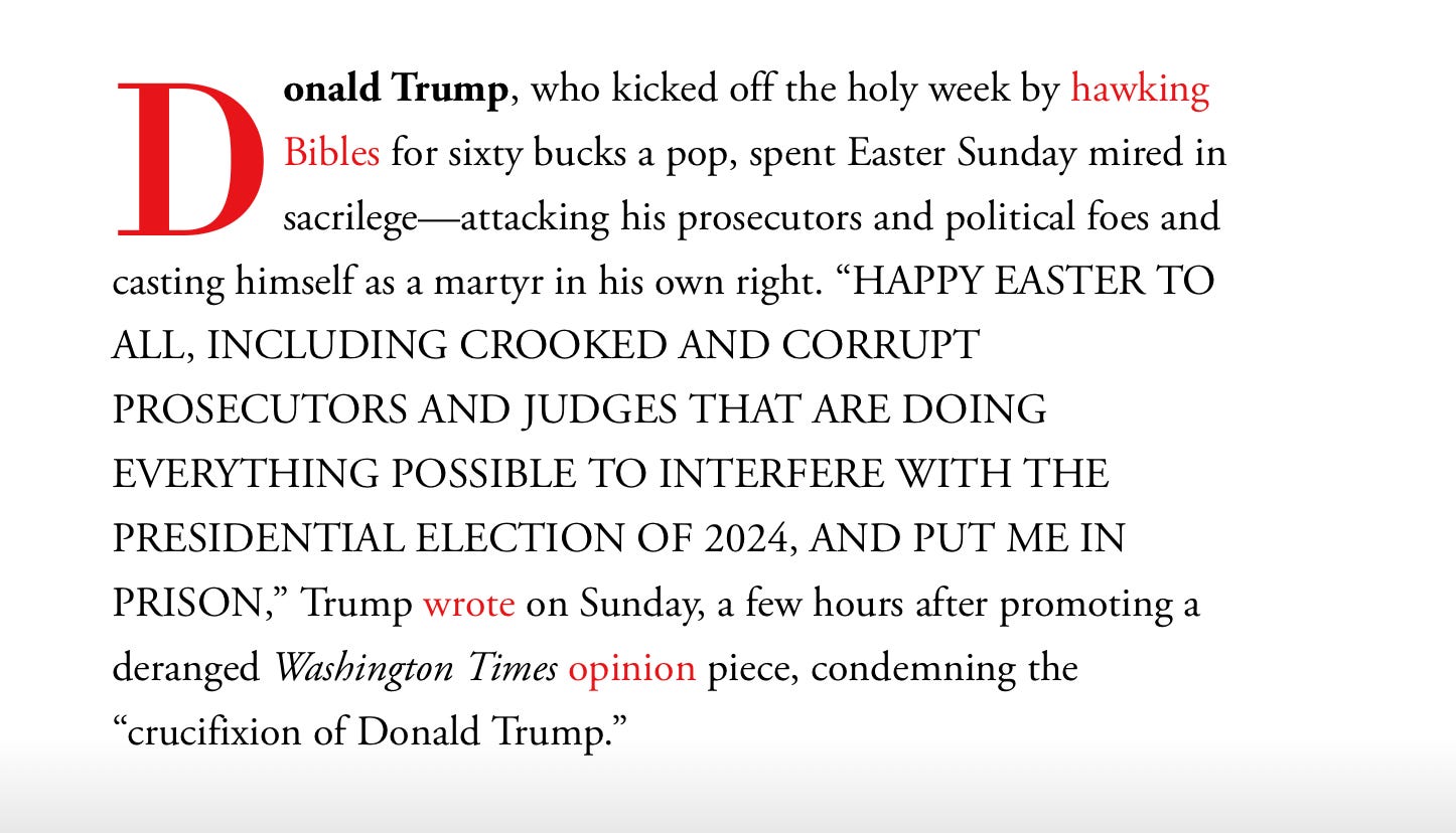 But that wasn’t all. He also posted several stories claiming miraculous backing for Trump’s candidacy, that he is “the Chosen One” and likening his legal troubles to those of Jesus’ crucifixion. It was a barrage of messianic mania, post after post of divine delusion. Vanity Fair, a publication not noted for its theological sophistication, referred to it as “Donald Trump's Impious Easter Sunday.” Their story opened with this: