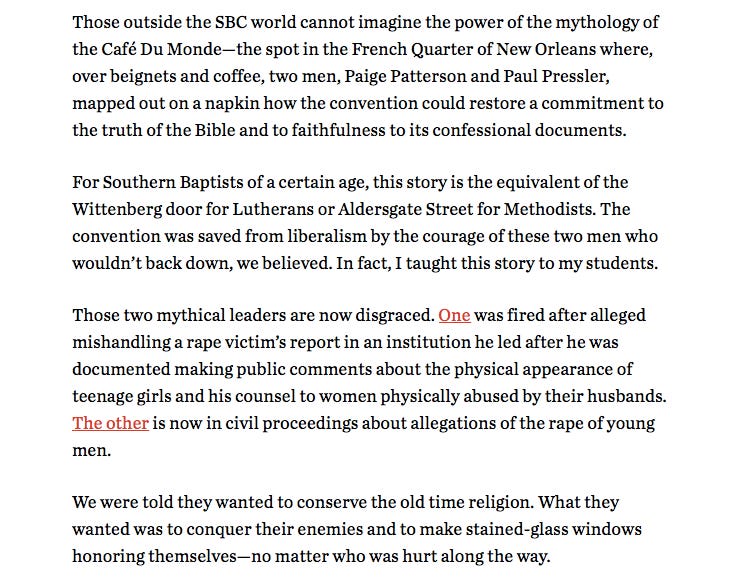 The Southern Baptist sex scandal isn’t about a few flawed men. It isn’t about a lot of flawed men. It isn’t about flawed leadership or flawed policies. It is a “success” story of the theological vision and social structure that Patterson and Pressler planned.