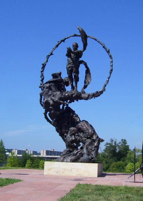 The new park is moving tribute to the human spirit. The gas station has been replaced with a soaring monument — Mario Chiodo's sculpture, “The Path of Thorns and Roses” — to freedom and the struggle to attain it.