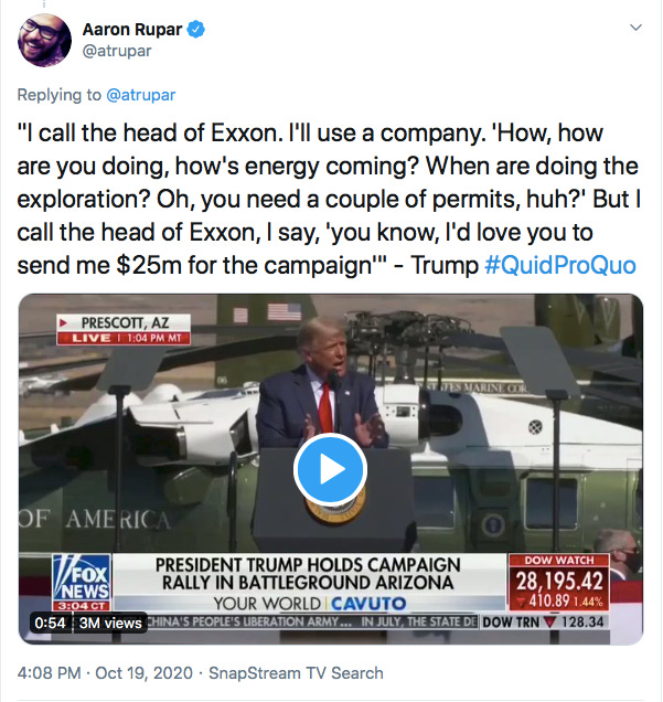 (10/20/20 10:58AM update: Exxon insists that Trump’s story was a “hypothetical” quid pro quo; the journalist, Aaron Rupar from Vox, made the “hypothetical” implication clearer in a follow-up tweet)