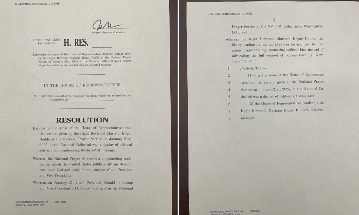 Yesterday, twenty-one members of Congress filed a bill to condemn the bishop publicly and denounce her “distorted message.”